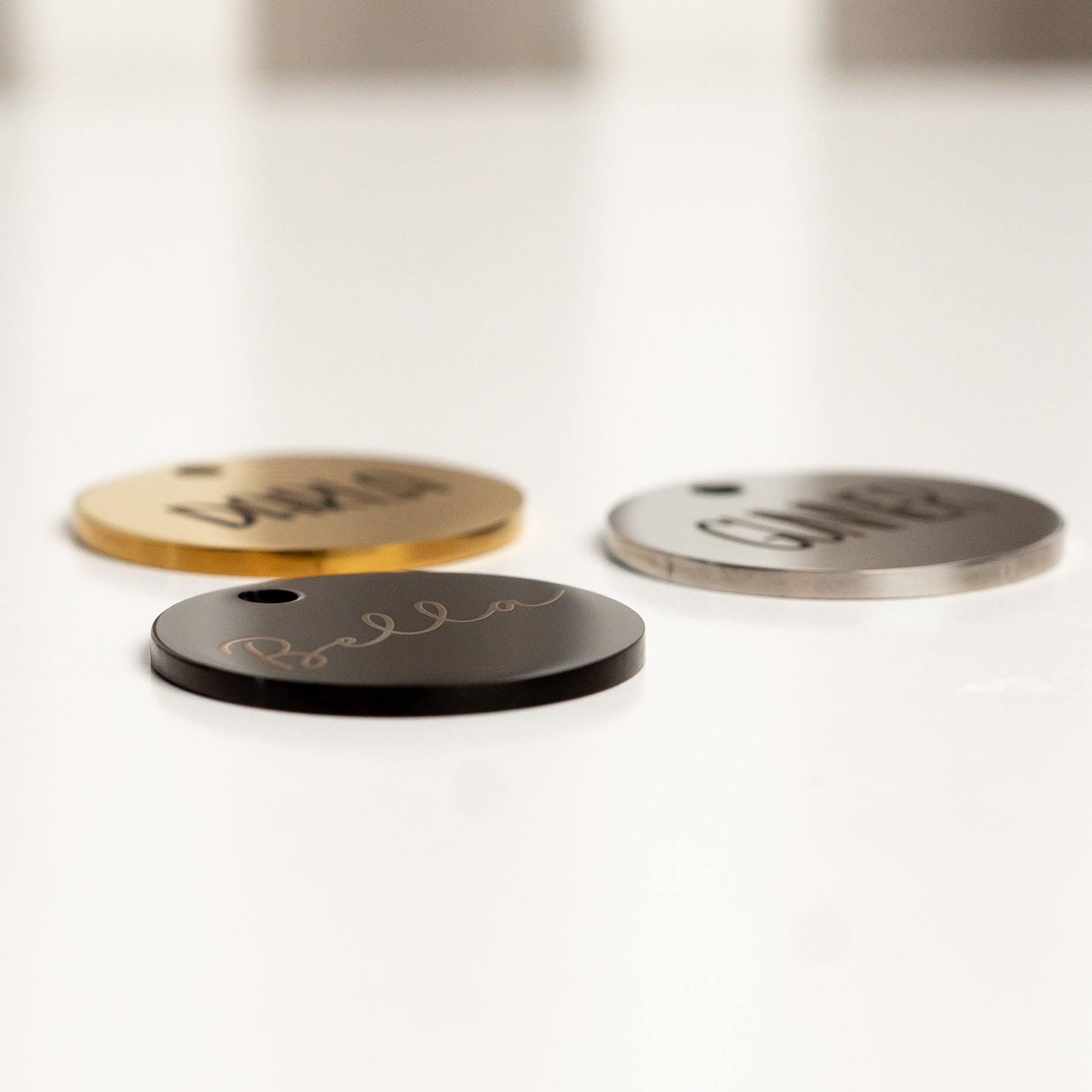 Each tag is custom engraved with your pet’s name on the front, with the option to add important contact information on the back. The sleek, minimalist design looks beautiful on any collar while remaining durable enough for everyday adventures.